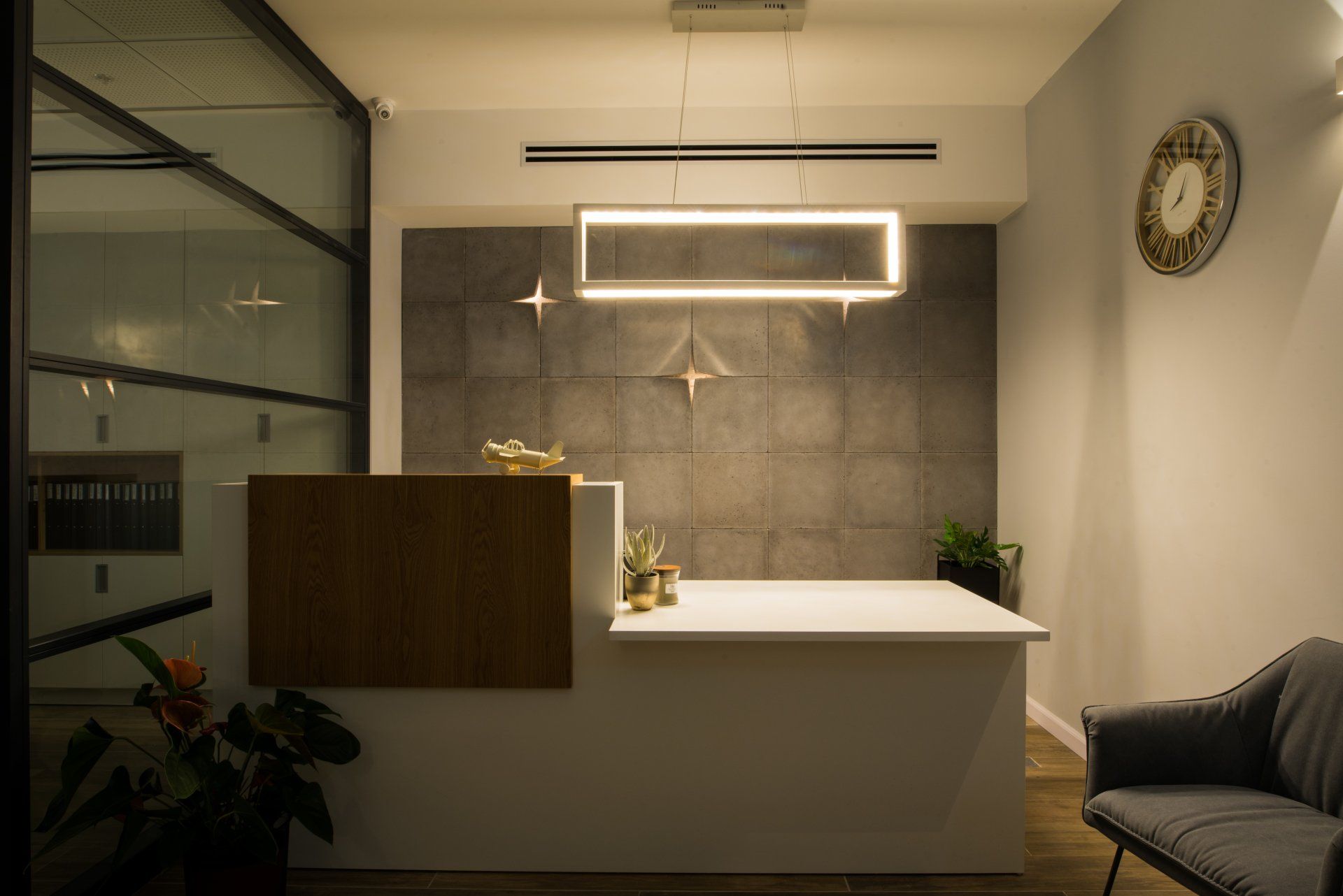 חלל מאתגר צר וארוך של 80 מ"ר שצריך היה להכיל: דלפק קבלה, עמדת המתנה, מטבחון עם מקום ישיבה לאכול, 8 עמדות עבודה ו 2 משרדים סגורים